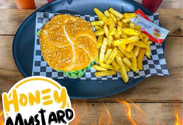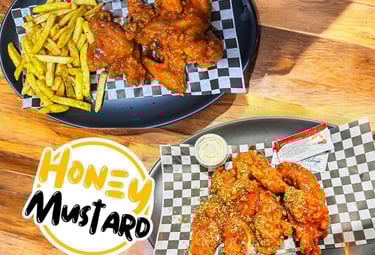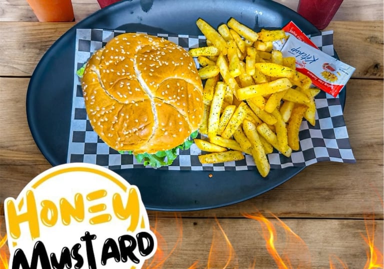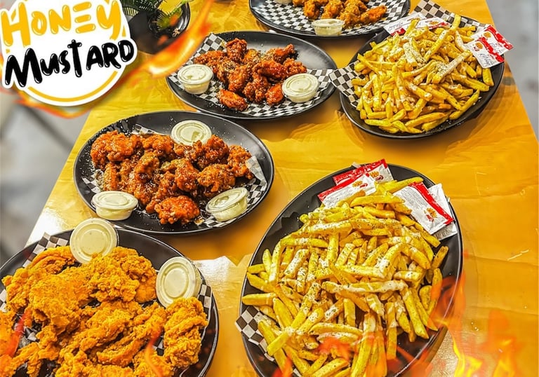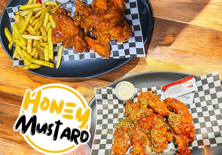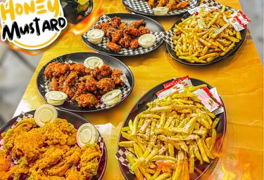 En Honey Mustard, disfruta de alitas jugosas, tenders crujientes y hamburguesas irresistibles en un ambiente acogedor con los colores amarillo, negro y blanco. Ven y vive el sabor que te hará volver.